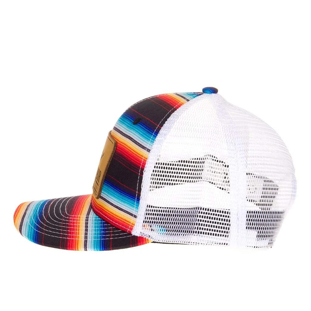 - This snapback cap features a colorful serape print on the front, white mesh back, and laser engraved leather Best Ever logo patch.
