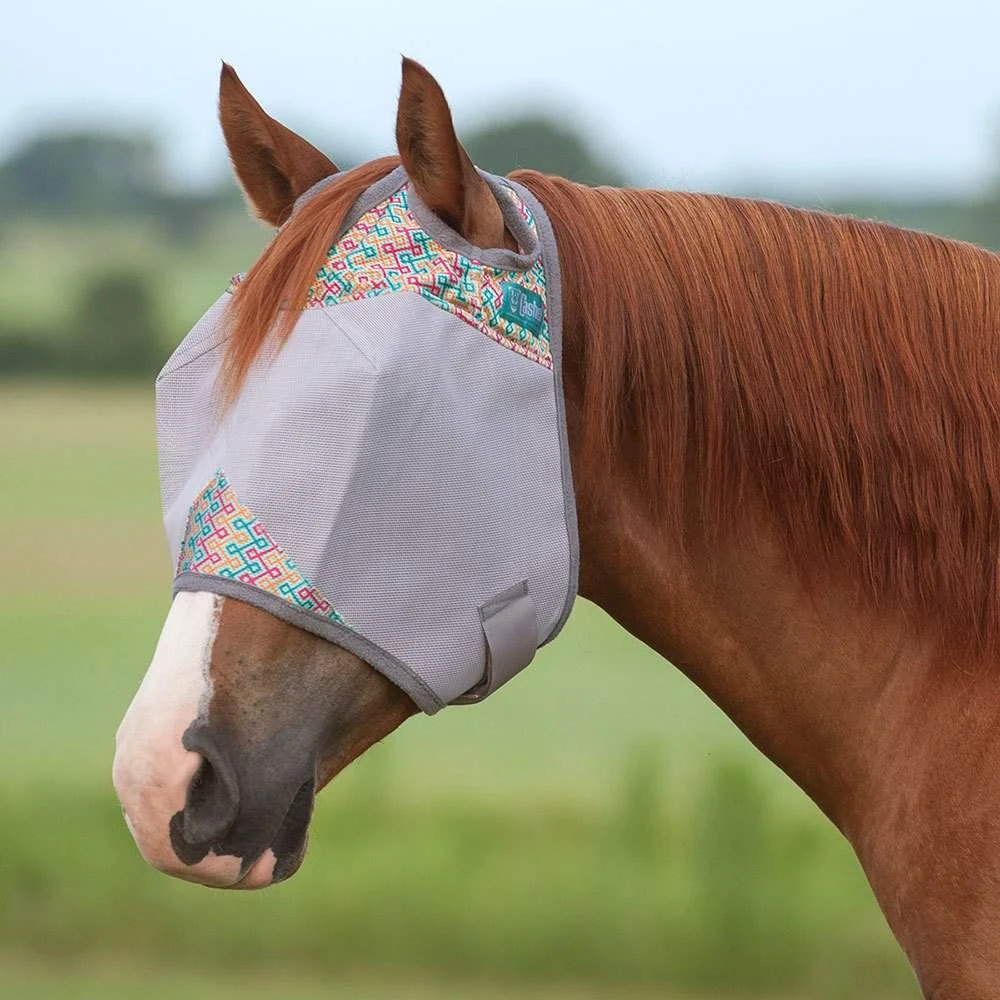 TheCrusader Fly Mask has a patented three hole cap which eliminatesforelock damage and ensures comfort with its unique design that staysput whether your horse is stalled or turned out. The soft coated micromesh blocks 70% of the sun’s damaging UV rays and protects thesensitive, soft tissues of the eyes and forehead.