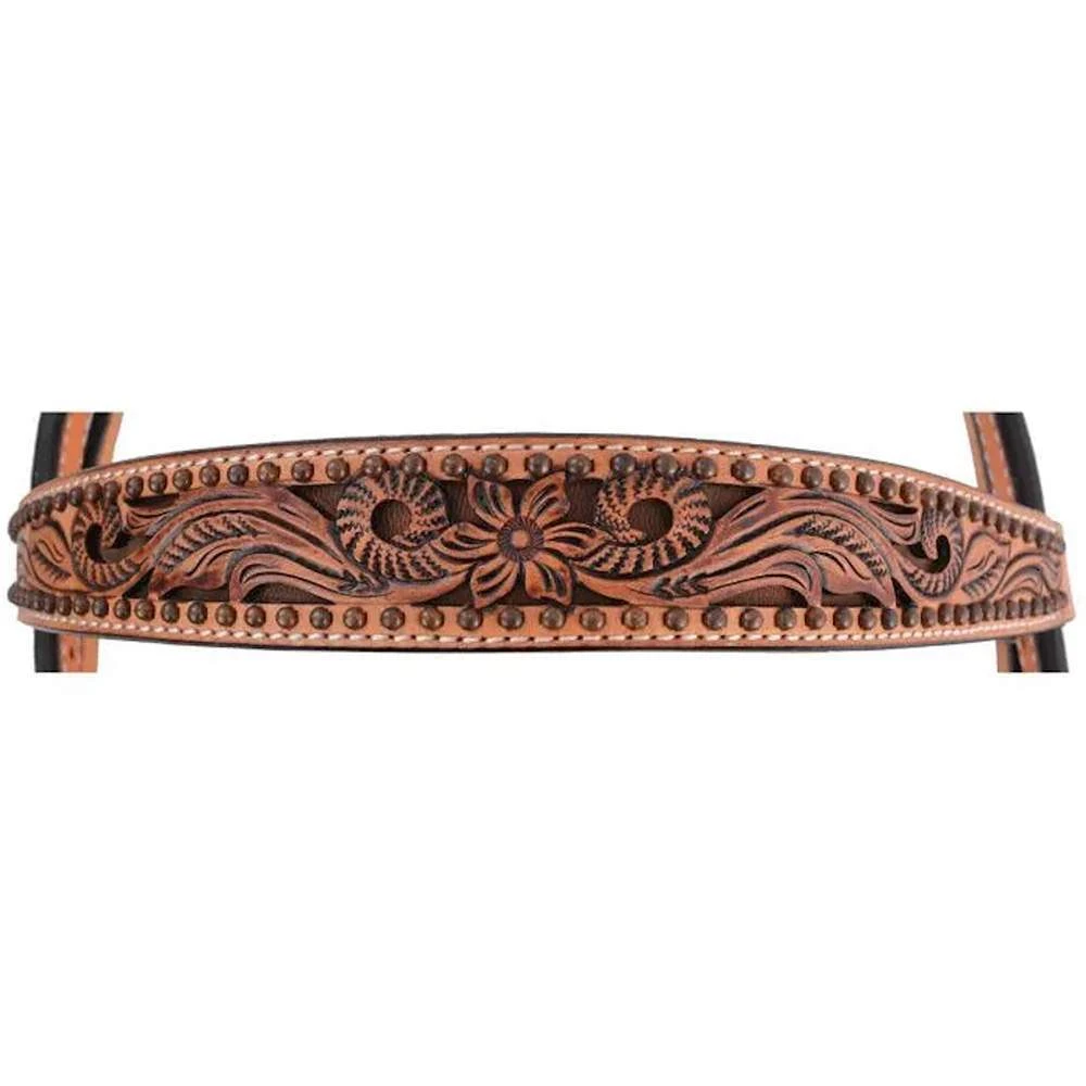 This Circle Y Texas Flower Browband Headstall is made from the finest leather and quality hardware. Designed to survive through endless days of work and play, this headstall works as hard as you do. Beautiful tooled “Texas Flower” design. Stainless steel hardware. Bronze dots to accent tooled design. Bit tie ends. 1011-12-S6