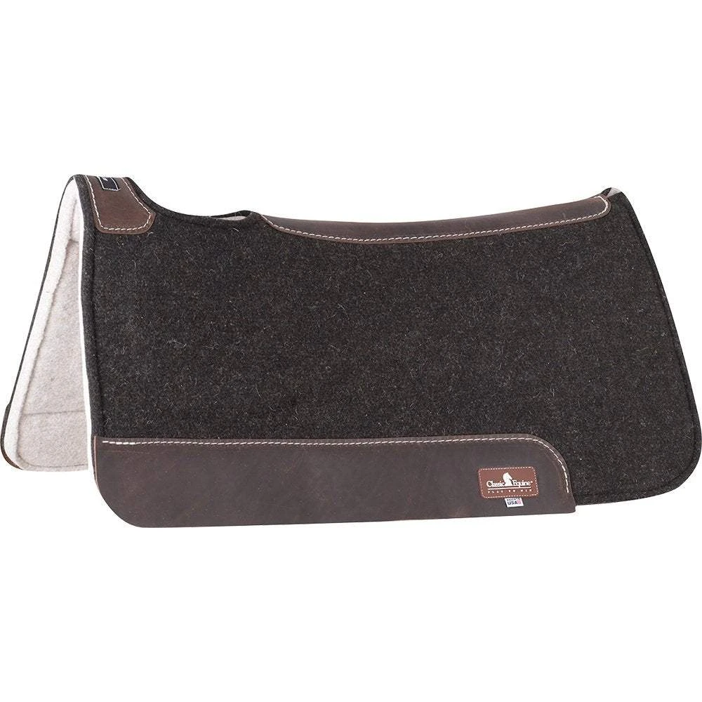 Wool blend top offers superior shock absorption and protection, and resists compression and matting for a longer life. 1/2″ memory foam middle layer is extremely conforming and temperature-sensitive. Continuously molds and conforms to the shape of the horse’s back then rebounds to it’s original shape when pressure is removed. Minimizes pressure points and relieves body stress. “Open cell,” allowing airflow in and out of the cells and pulling sweat away from the horse. 5/8″ orthopedic grade felt bottom soaks up moisture, allowing heat to dissipate away from your horse’s back. Conforms to the horse’s back while maintaining density and provides excellent shock absorption. Felt is washable and grime can be washed away as needed. Cut-out withers and contoured to fit your horse’s back with a split design that allows the pad to move with the horse; butterfly cut for closer leg contact. Designed to be used alone or with a blanket.