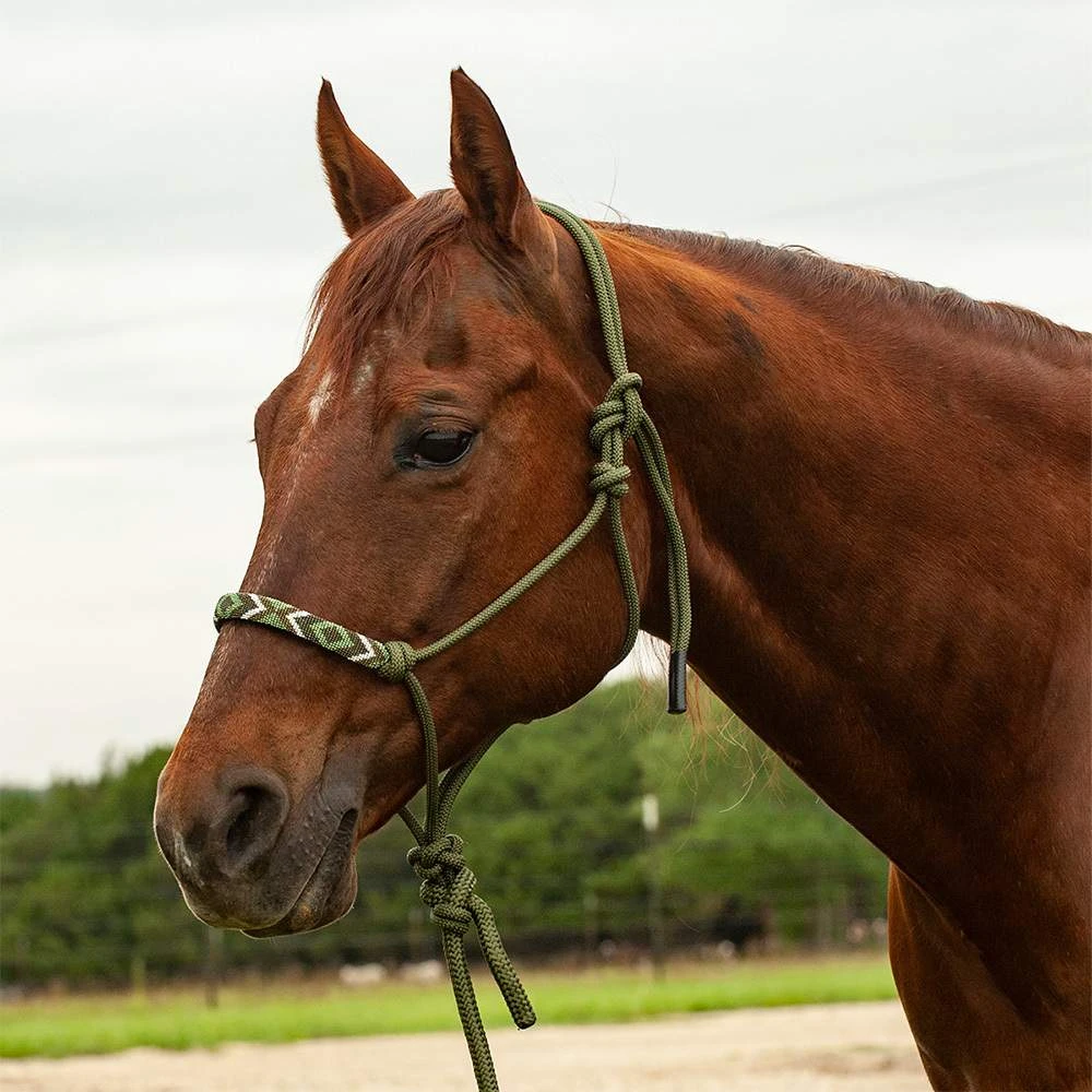 This beautiful olive green beaded rope halter by Classic Equine has a 9ft lead rope. This halter is made up of durable nylon/poly rope. This halter will fit an average horse.