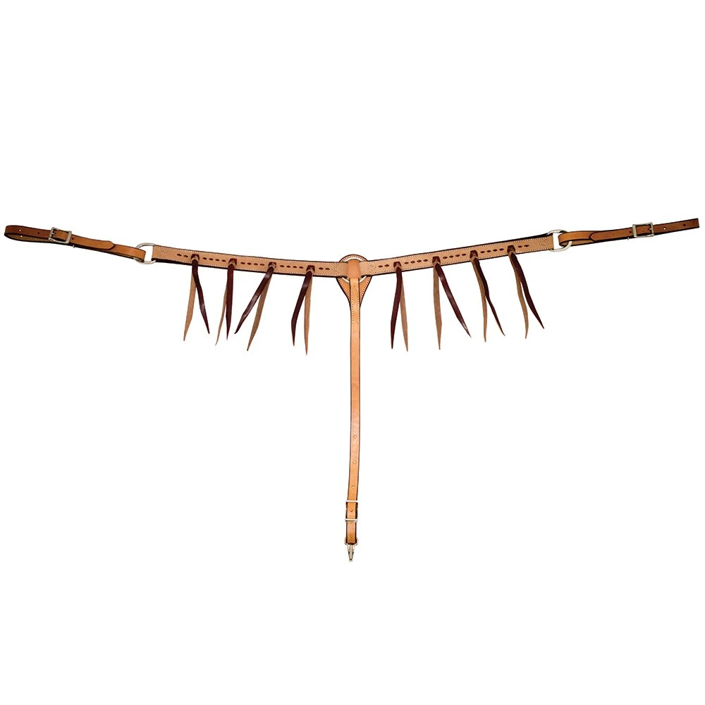 Golden roughout saddle leather breast collar with buckstitch and Latigo Cowboy strings. Includes tug straps and roller buckles.