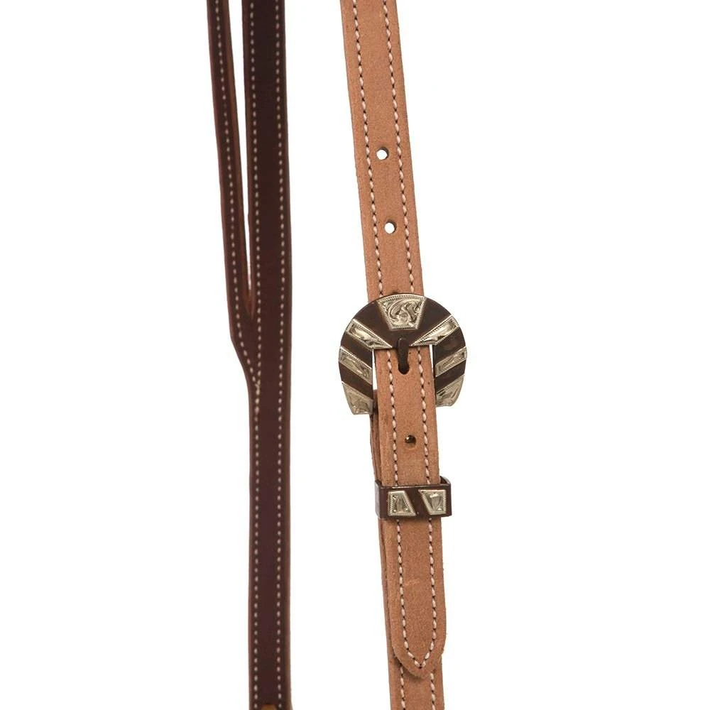 This 3/4 inch roughout natural leather headstall has an antiqued bar buckle and keeper with bit tie ends to easily change bits.