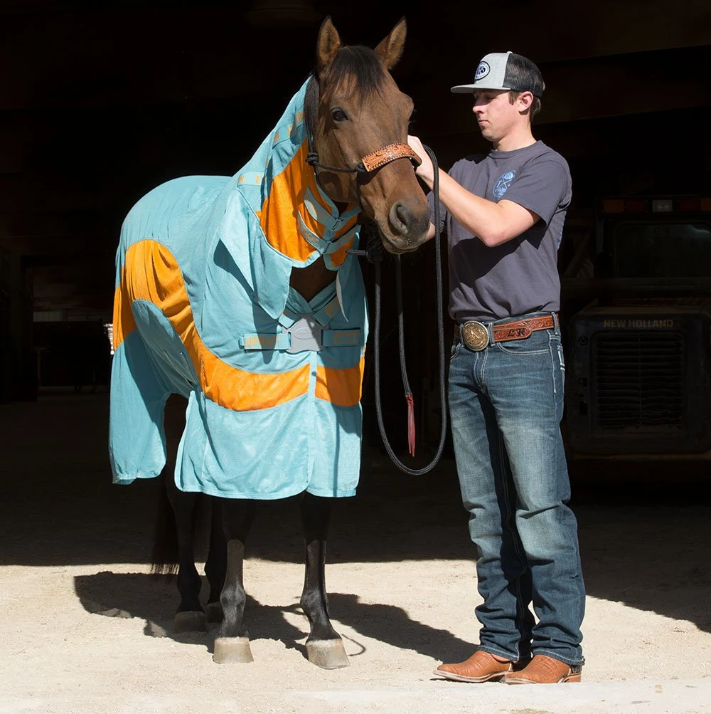The Evolution Fly Sheet utilizes an innovative and super light disc front closure with the latest in insect technology. Insects respond differently to different colors, most cannot perceive orange or aqua, because their vision centers on different sections of the electromagnetic spectrum, making these colors natural deterrents. The Evolution sheet incorporates these colors with the breathable, lightweight knitted polyester net fabric which is soft, absorbent, and has sun reflecting properties that offer UV protection.