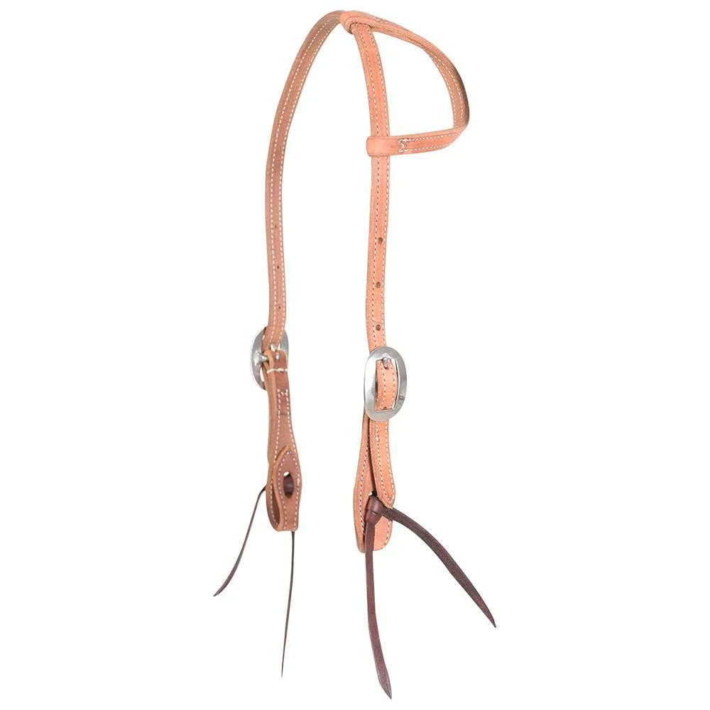 This Martin Saddlery headstall is a single ear gag constructed of stitched natural harness leather with cart buckles and bit ties.