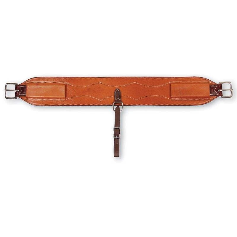 Contoured ends will not interfere with spurring. Heavy saddle skirting with a latigo liner, sewn together with heavy nylon thread. Hand-rubbed, dyed edges and stamped borders. Roller buckles are secured with copper rivets. Biothane keepers included.