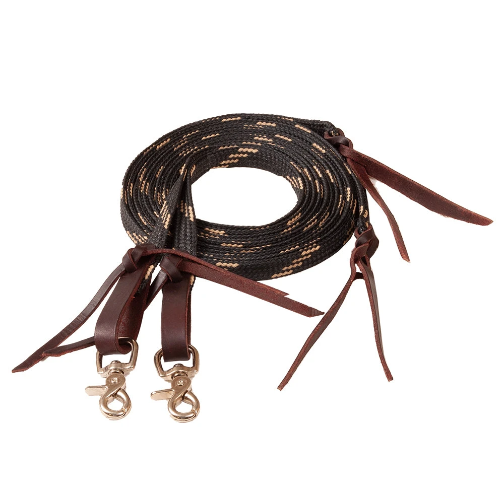5/8″ x 8′ Flat split rein with latigo water loop and nickel plated scissor snaps and blood knot latigo poppers.