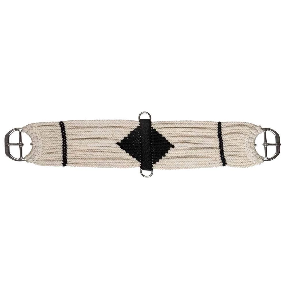 This Mustang Manufacturing 17 strand mohair blend cinch is built on stainless steel center bar buckles with a black wrapped nylon center and black braided diamond and crossbars.
