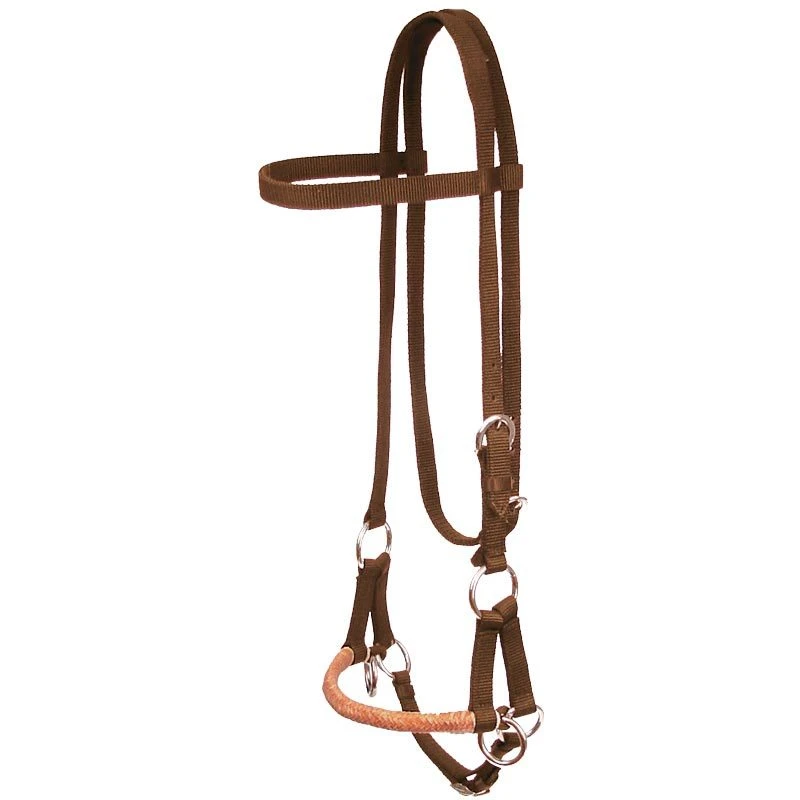 Nylon side pull with a braided rawhide noseband. Durable 3/4 in. nylon browband headstall with adjustable chin and a buckle adjustment at the cheek & throat latch.