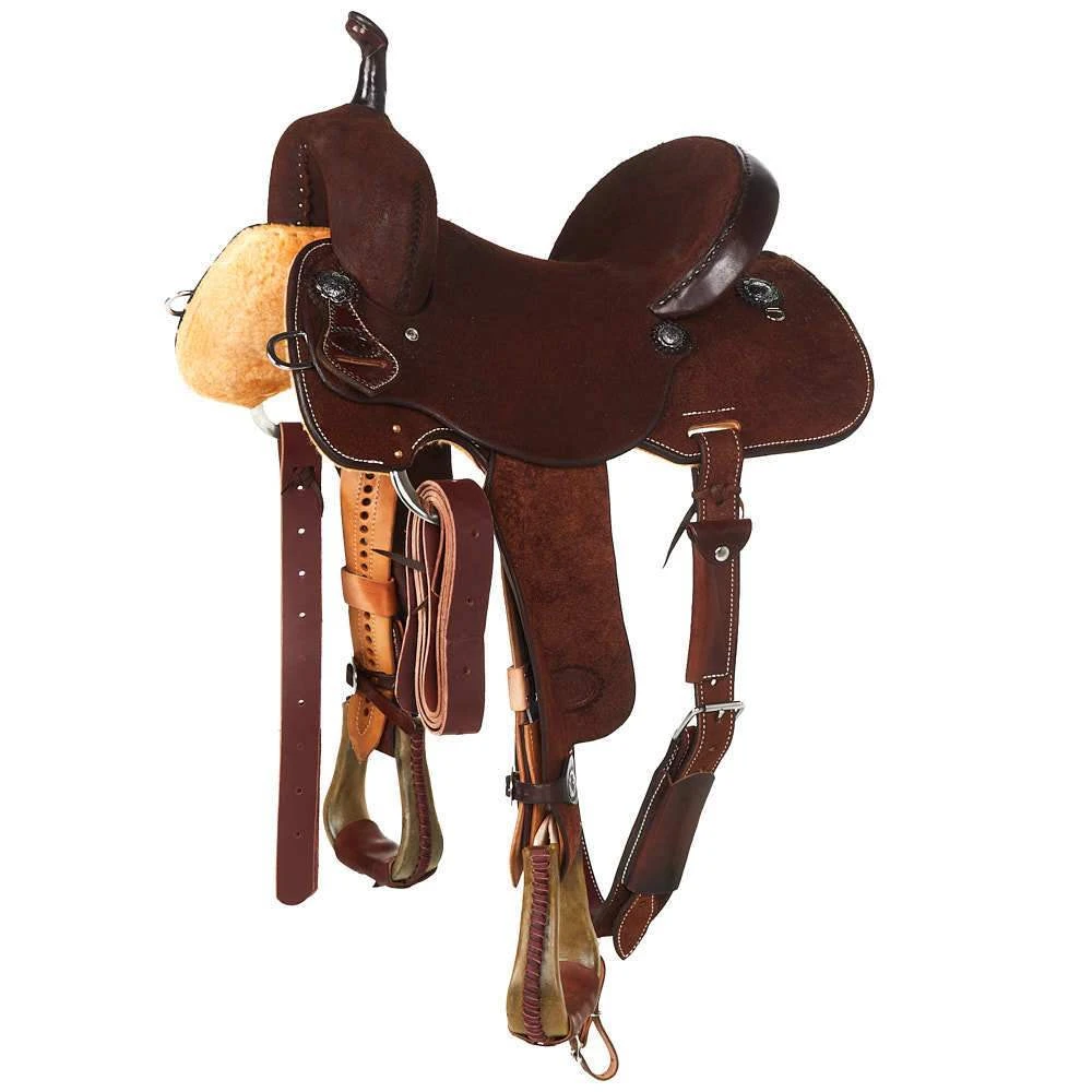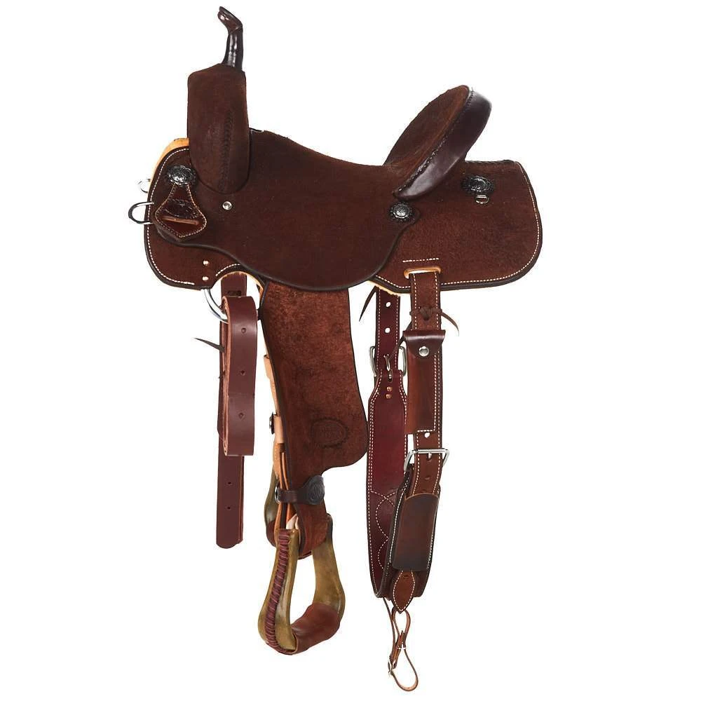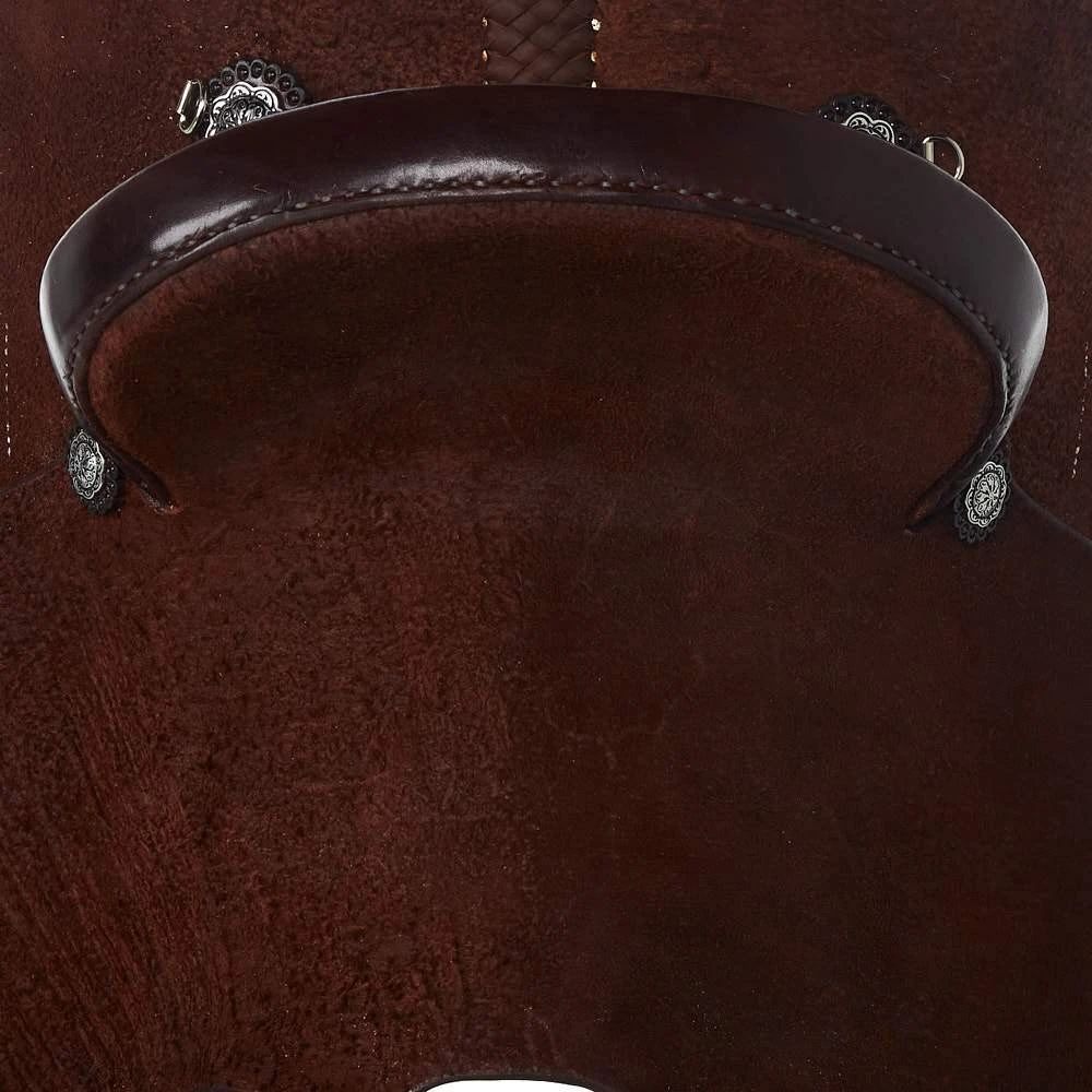 This NRS Competitor Series Barrel Racer has a 5 year warranty on the rawhide covered wood tree, antique floral Conchos, barrel stirrups, all roughout chocolate leather, front and back in skirt Dees, southwest chic inlaid seat, a square skirt and 90/10 wool blend lining. The seat pocket is constructed to help hold the rider in place and offer better balance effectively giving the rider every advantage.