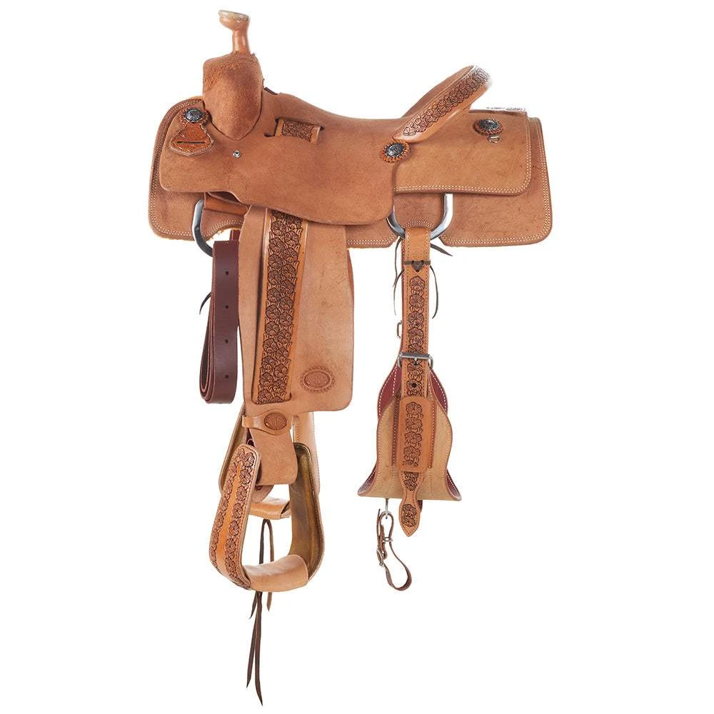 This NRS Competitor Series Team Roper has a 5 year warranty on the rawhide covered wood tree, roper stirrups, tooled cheyenne roll, natural leather with an antique finish, front 7/8 drop rigging, a hard loop seat and 90/10 wool blend lining. The seat pocket is constructed to help hold the roper in place and offer better balance effectively giving the roper every advantage.