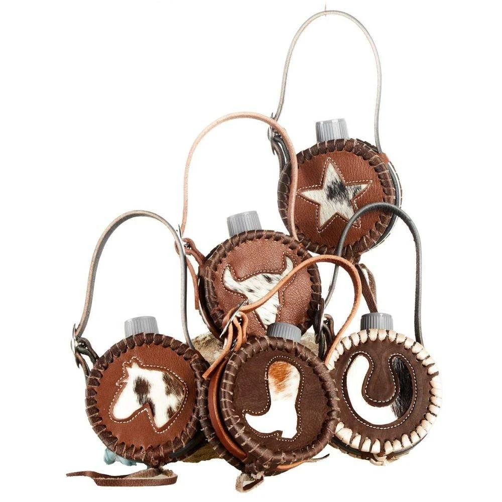 These Leather-Covered Mini Canteen with Inlay by Rockin Y are the perfect addition for your trail ride and more! They are approximately 4″ in diameter and constructed out of genuine leather. Smooth grain leather on the outside with a cute cut out cowhide inlay. The edges of these canteens are laced for a decorative, finished look. Comes with a carrying strap. Colors of leather varies individually. RY-MCANTEEN
