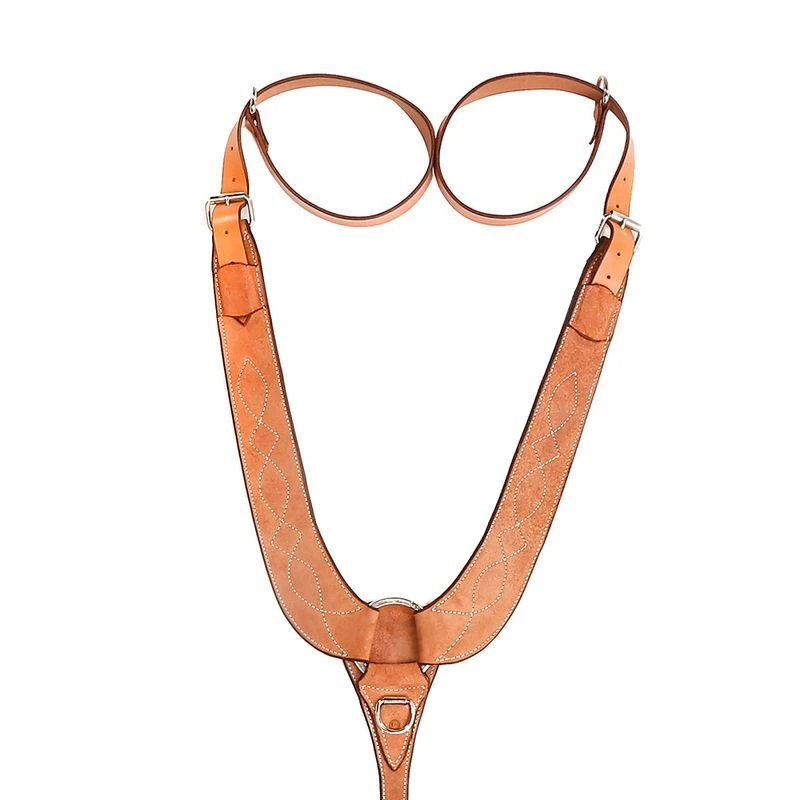 This is a punchy collar!! The leather has is roughout so it’s fairly light and the stitching gives it just a little show. The tug buckles have rollers for easy adjustment and it has a tie strap dee ring on the breast.
