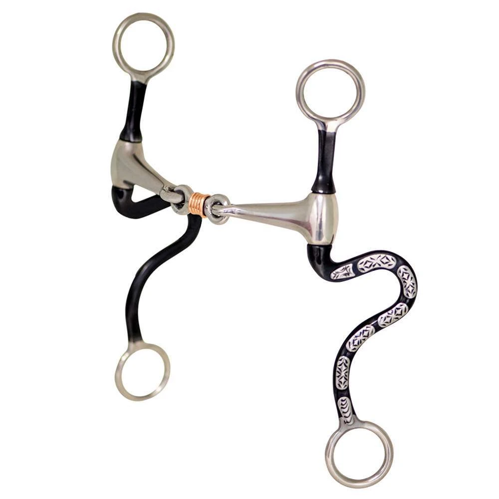 This Cowboy Tack Diamond Back Dogbone Bit is part of the “Diamond Back” Collection and features a 8-1/2″ S Shank and 5″ mouthpiece with copper inlays on the bars and a copper wrapped center for increased salivation and taste appeal to the horse.