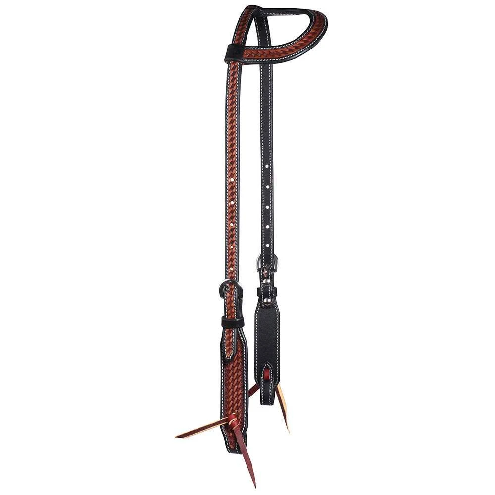 This versatile basketweave single ear headstall will be at home in almost every discipline. Hand tooled chestnut brown leather with a black border. Quality construction.