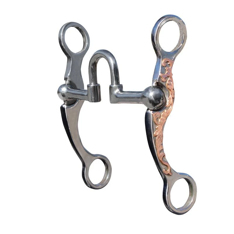 This weighted cheek allows for more control and added poll pressure while maintaining clean lateral movement. The cheek pieces are polished steel with copper scrolling. The mouth is polished sweet iron that keeps the horse’s mouth moist, allowing the bit to move freely.