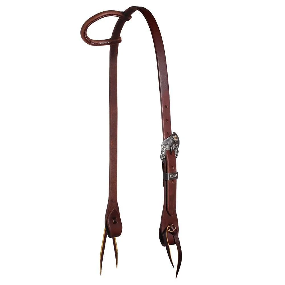 Single-ply 12 oz plus harness leather single adjustment single ear headstall. Heavy oil with tie cheeks. Buckle holes are oval for easy adjustment. The buckles are stainless steel with a Elvis design.
