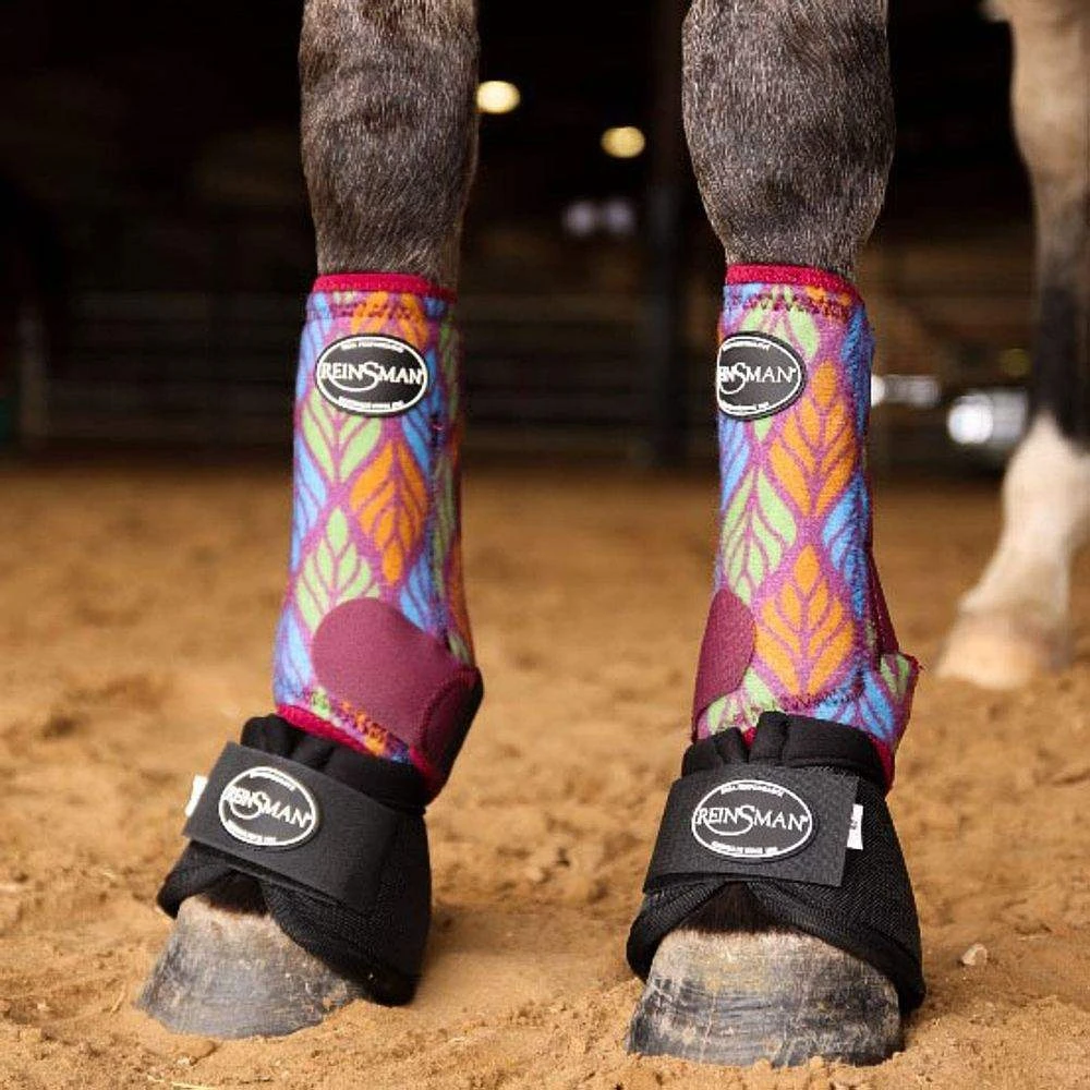 Reinsman Apex 2 Pack Performance Sport Boots are the perfect choice for those who love traditional and vibrant colors. These soft and comfortable performance sport boots are designed to provide supreme impact protection and keep dirt out. These splint boots feature strong hook and loop straps to keep the boots in place, while the ventilated material maximizes airflow to keep your horse’s legs cool. The sling system is easy to use and provides support and protection. Additionally, the design includes a reinforced kevlar heel strap for additional impact protection and longevity. With three sizes available, horses of all sizes can benefit from these boots. To ensure the right fit, it’s recommended to measure the horse’s leg. As a general guideline, small fits around 14-14.3 hands, medium fits 15-15.3 hands, and large fits 15.3+ hands. The product number is 9126 and they offer solid, patterned, and solid with patterned strap color variations.
