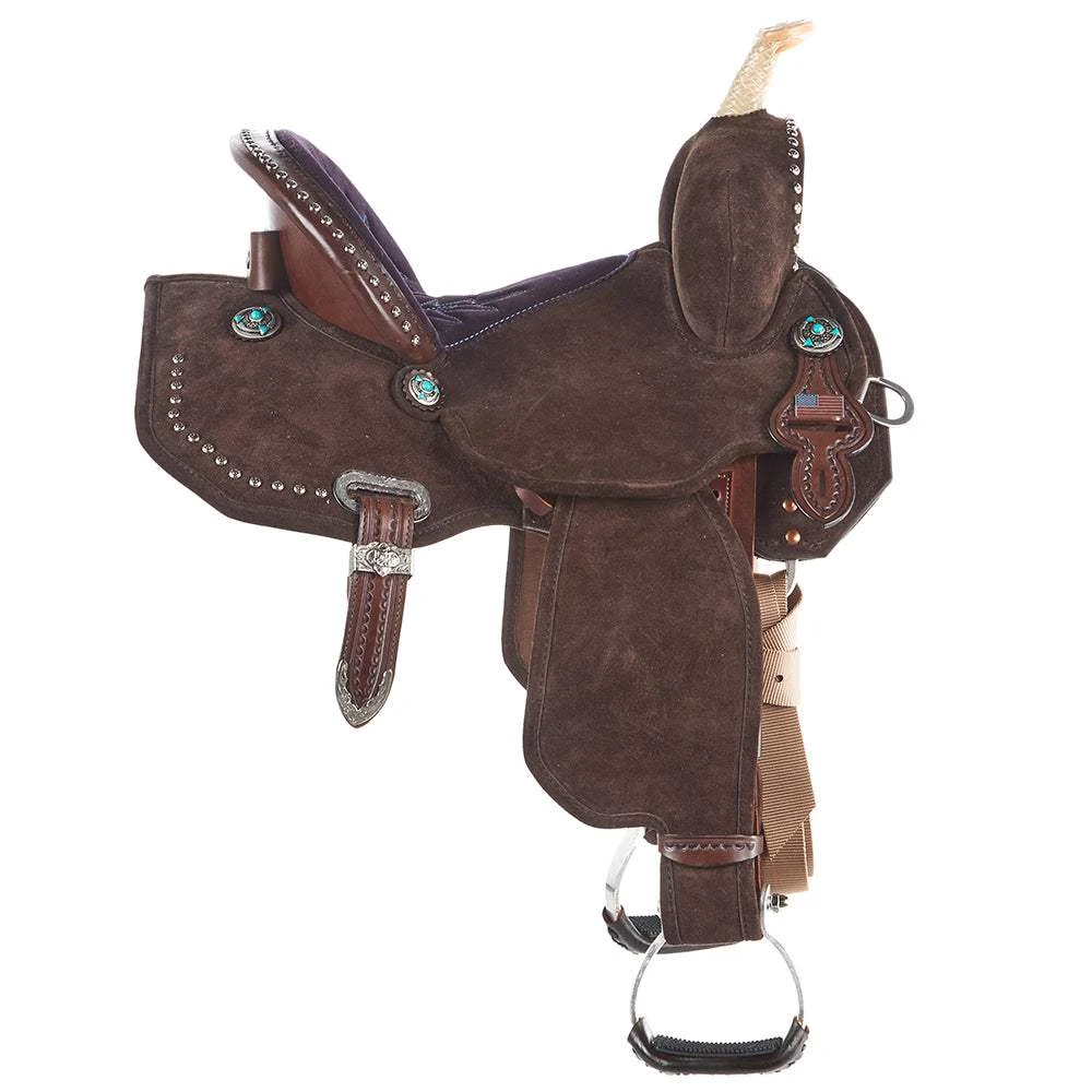Introducing the Josey Mitchell Lightweight Lightspeed Barrel Saddle, crafted to offer optimal performance and style. This saddle features a Wide Ultimate Cash DURAhide tree, providing durability and stability. The Cheyenne cantle measures 5 inches, offering a comfortable and secure seat. With a 13-inch swell width, the saddle ensures excellent balance and support. The horn stands 4 inches tall with a 2 1/4-inch cap, allowing for easy grip and control. The saddle is adorned with chocolate roughout leather, giving it an attractive and rustic appearance. A full, parachute dot border adds a touch of elegance, complemented by turquoise arrow conchos. The padded purple suede seat boasts turquoise stitching, combining comfort and eye-catching aesthetics. For added convenience, the saddle comes with Josey aluminum stirrups. Weighing 24 pounds, it strikes the perfect balance between durability and portability. The three-way rigging system provides multiple options for securing the saddle, ensuring a secure fit. The forward-hung fenders and stirrups enhance rider positioning and comfort during barrel racing. The locking Blevins buckles guarantee a high-tech, reliable tack solution. Rest assured, this saddle is proudly made in the USA, meticulously built in Yoakum, Texas. Experience the excellence of the Circle Y Martha Josey Ultimate Cash Barrel Saddle, designed for both performance and style. Product Number: SPMJ01-V30C-05-1