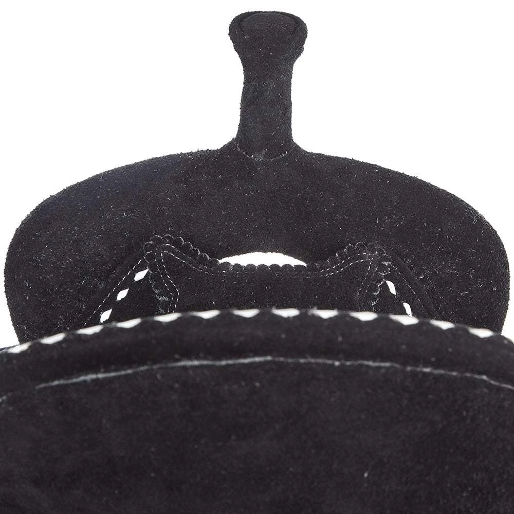 Introducing the Tomahawk Black Roughout 14 Inch Lightweight Barrel Saddle. This Brazilian Light Weight Saddle is crafted for superior performance and comfort. With its black roughout leather finish, it boasts a sleek and modern appearance. The white buckstitch border adds a stylish touch and enhances the saddle’s overall design. Equipped with aluminum stirrups, this saddle ensures durability and reliability during your rides. A matching breast collar is included, providing a coordinated look. Weighing under 20 lbs, this saddle is lightweight and easy to handle. It also comes with a 10-year tree warranty, guaranteeing its quality and longevity. Product Number: TH-BAL00614W45.