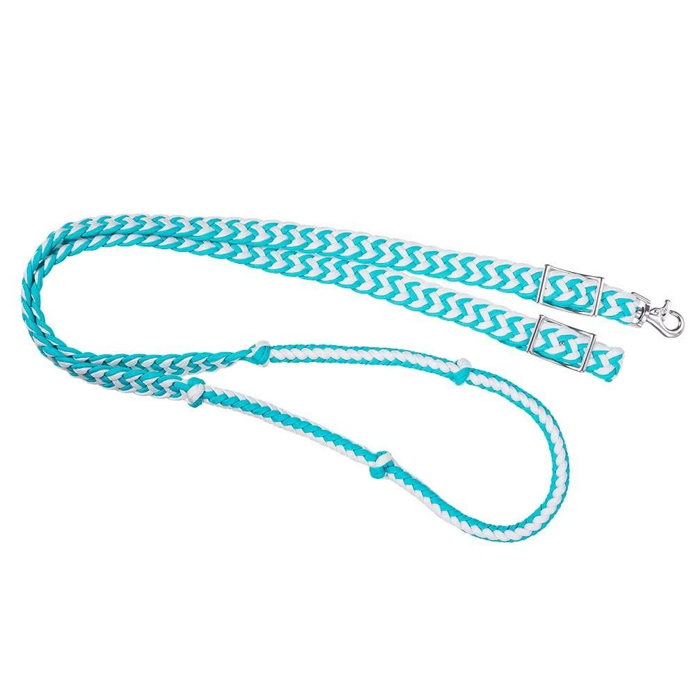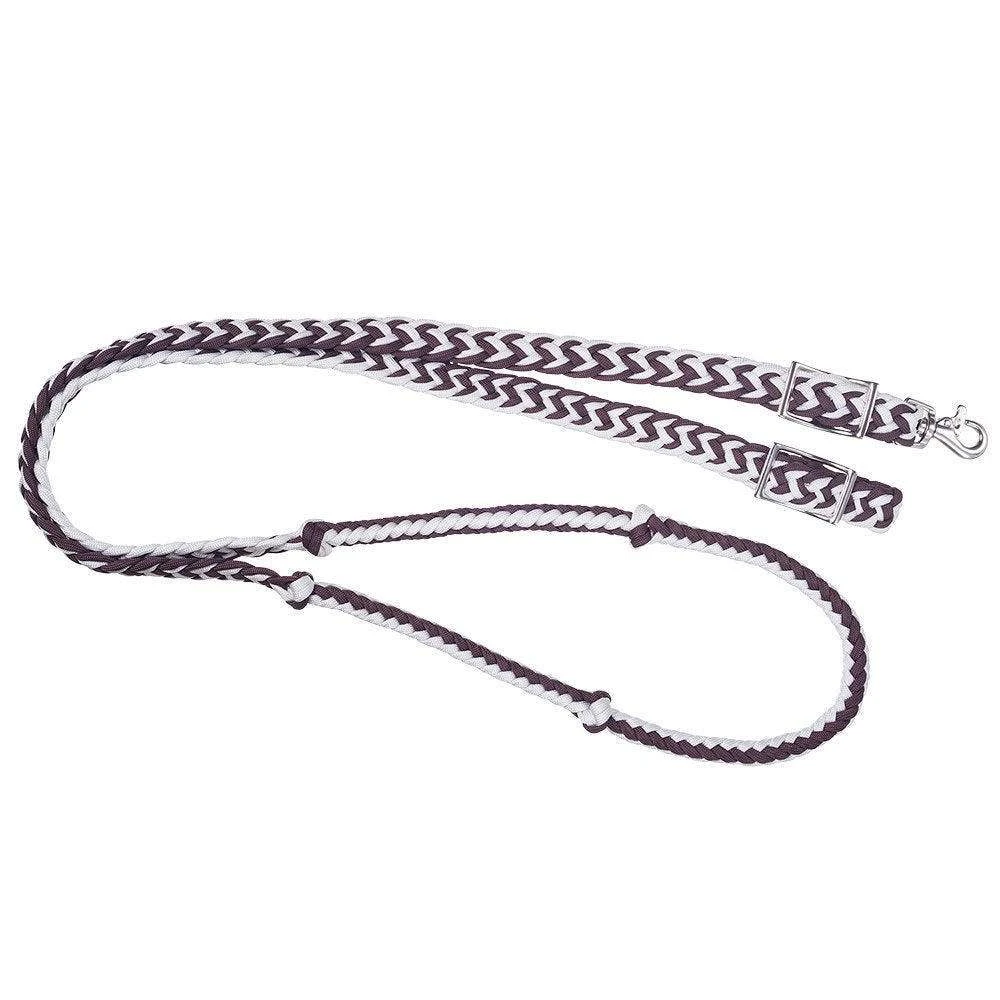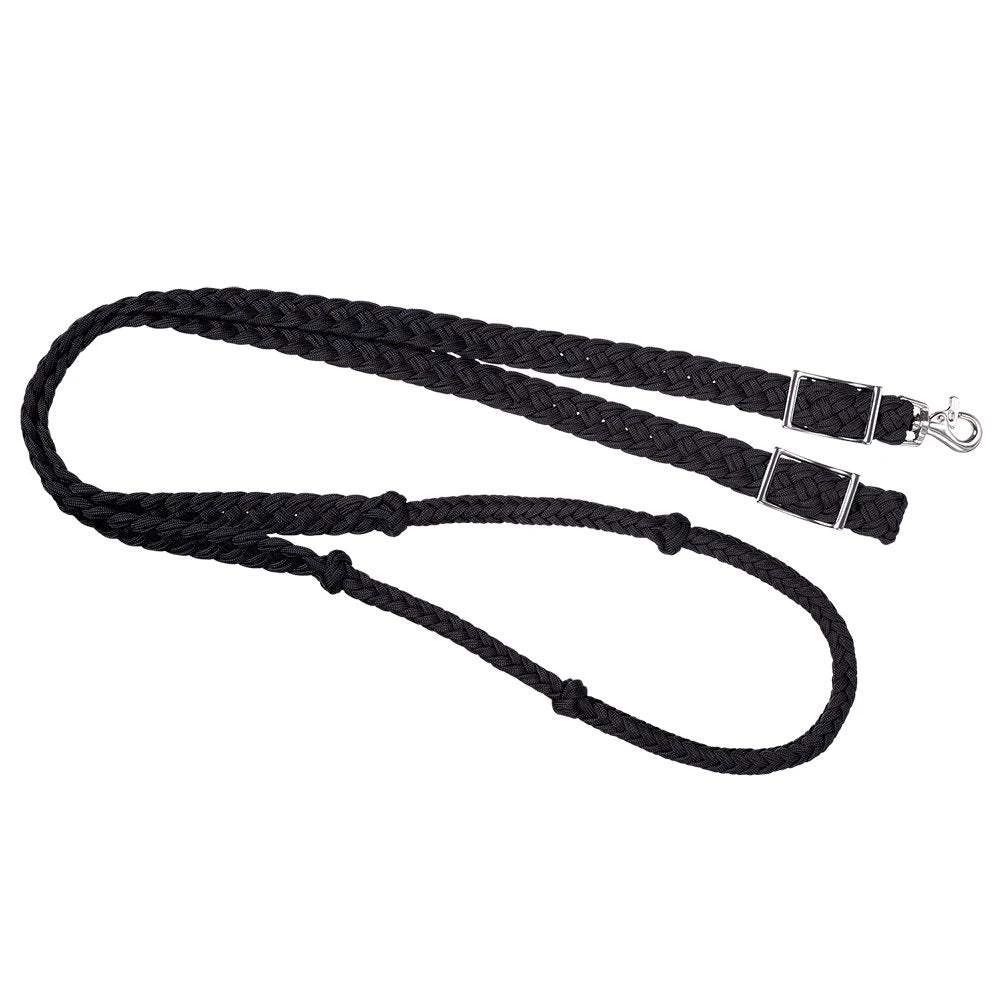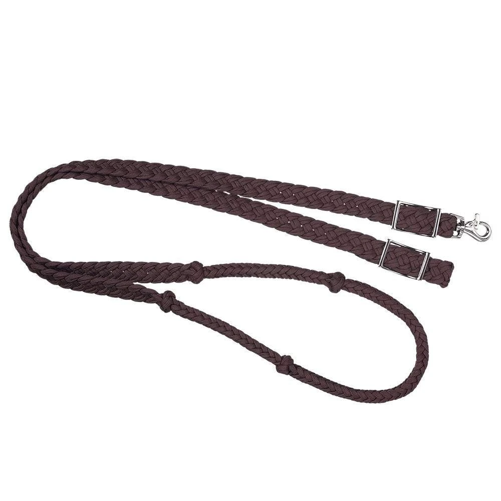 Top of the line cord knotted roping rein. Knotted for better grip and control. Scissor snap on one end. Adjustable with conway buckles. 8′.