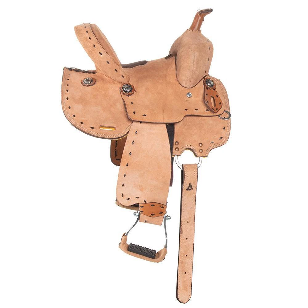 Natural Roughout Brown Suede Inlaid Seat barrel saddle. Features brown buckstitch.