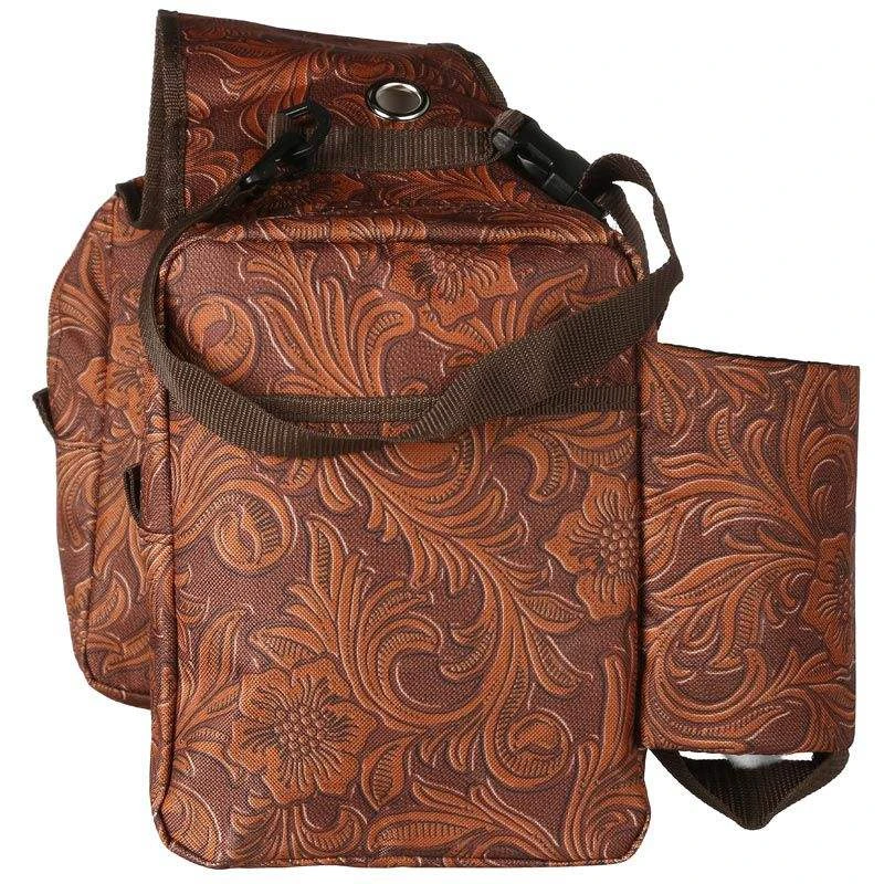 Heavy nylon with two large zippered pockets (7″ x 9″), solid outside pocket on one size and mesh pocket on other side, two insulated water bottle pockets, two adjustable bedroll/slicker straps with snaps, and two grommets for attaching bag to saddle.