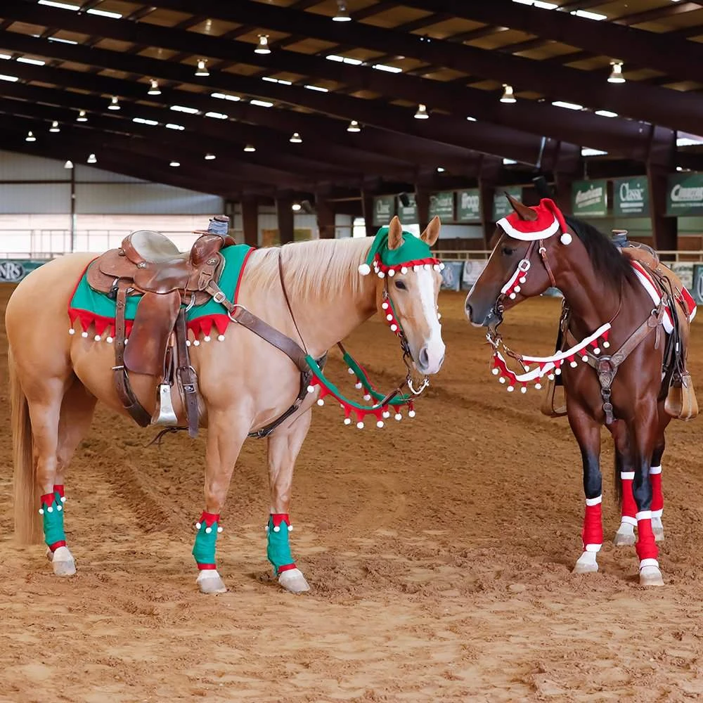 Your horse will be Christmas ready with this 5 piece Santa set.Celebrate the holidays with this red felt and white felt set. Great for parades, clubs, pony rides, costume classes and Christmas photos.