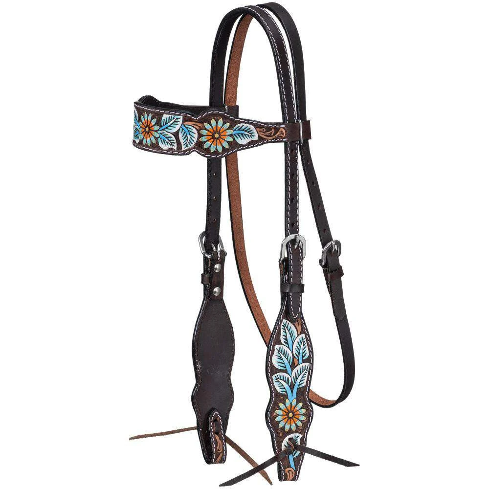 This rich, dark oil browband headstall is constructed from supple, premium leather with stainless steel hardware. Cheeks and brow feature beautiful vintage inspired floral and leaf hand-painted designs in shades of turquoise and orange that offer a bold contrast to the dark leather base. Complete with a single-stitched white edge and tie bit ends.