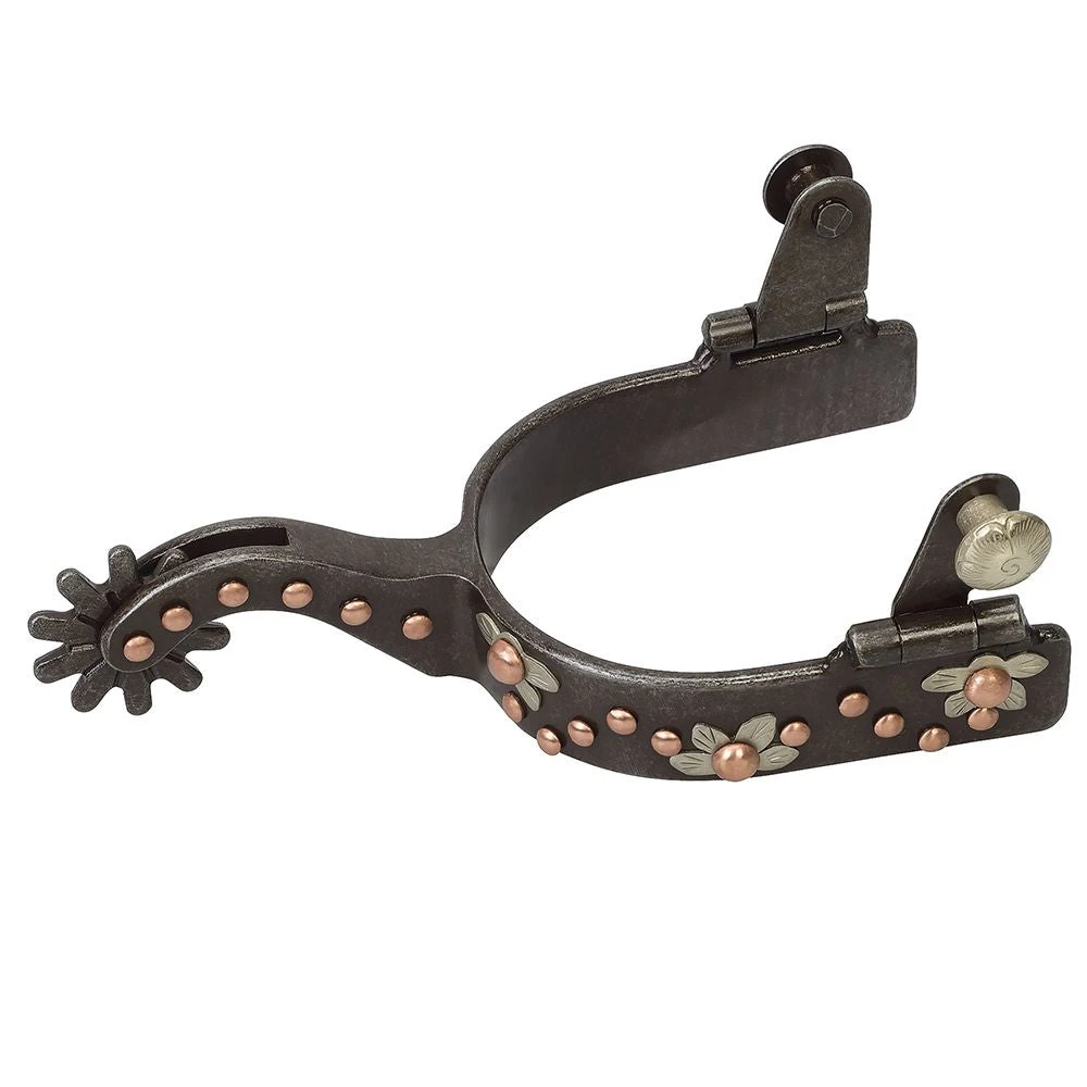 These spurs were designed with the right weight and balance so they hang properly on the boot without riding up. Features on-trend German silver engraved trim.